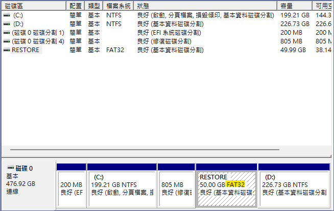 Windows10開始磁碟格式化FAT32限制在32GB以下,可以透過Gparted Live USB處理超過32GB的FAT32磁碟格式,但是我一開始沒留意所以做出了NTFS,由於RESTORE還需要隱藏磁區,所以後來改用mini tools partition來處理RESTORE分割區的問題。