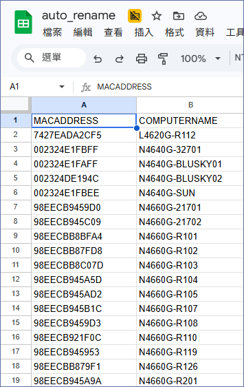 接下來自動更名的處理是關鍵,該如何讓每台電腦知道自己的教室位置或編號?本來想在本機製作一個清單讓程式比對後進行更名,但這個清單會變成日後無法即時更新。所以必須改為線上方案,可是卡在資安考量我SMB服務都透過AD封鎖了,找個單機或NAS來處理這件事又顯得礙手礙腳,也需要處理權限問題,測試時也覺得不理想。最後問了AI可以透過Google試算表來處理嗎?哈~解決了…