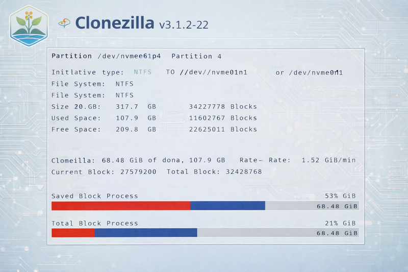 開機選單選好之後按下ENTER就會開始還原,底下為還原示意圖(與現實不符),因為我從影片中擷取還原進度的畫面解析度不佳,丟給AI優化結果出了這張很夢幻的還原進度圖,真要改成這樣超出我能力所及,留著欣賞紀念一下就好…