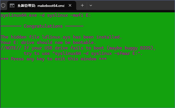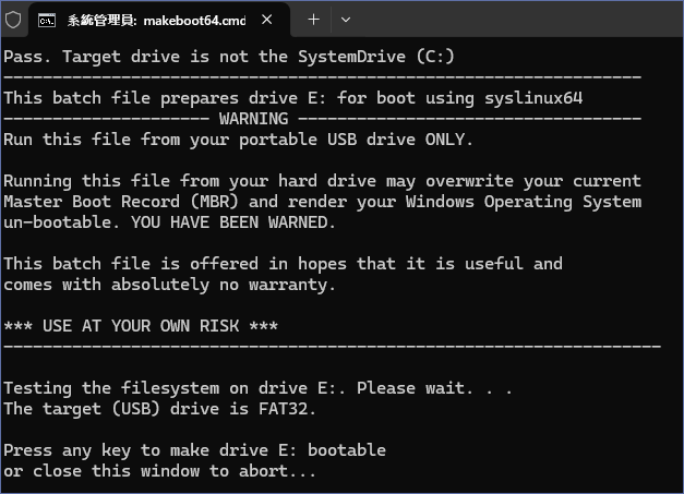 6.最後進到RESTORE\utils\win64底下執行makeboot64.cmd,按一下任意鍵開始檢查RESTORE環境是否為FAT32