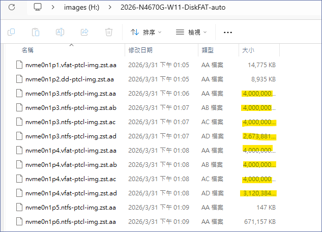 接下來就可以進行作業系統安裝,Windows11系統+更新+軟體很容易就4-50GB,所以C碟我都切200GB。為了將還原映像檔做在本機所以切了一個FAT32的RESTORE分割區,N4670G硬碟有500GB所以留50GB給RESTORE,D磁碟仍游刃有餘;但是N4660G硬碟只有238GB,在備份c碟之後映像檔實際需要21GB,所以很勉強的在N4660G上只切22GB容量給RESTORE,而它的D磁碟就只剩下很難看的15GB左右。