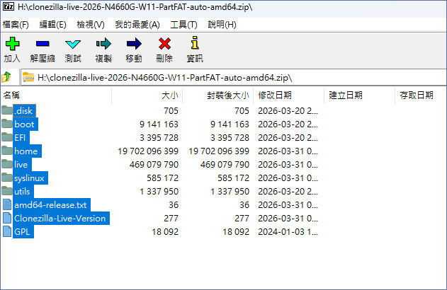 3.因為需要製作產生回復專用的映像檔.zip,在將FAT32底下製作出來的映像檔再次透過再生龍製作產生回復專用的映像檔.zip時,因為這個打包的zip檔案最後一定會超過4GB,但FAT32不支援單一檔案大小超過4GB,所以可以先複製FAT32裏頭的clonzilla映像檔到其他NTFS磁碟掛載後再進行轉換來產生回復專用的映像檔.zip,這樣產生回復專用的映像檔.zip檔案大小在超過4GB的情況下才能被NTFS磁碟區保留下來。