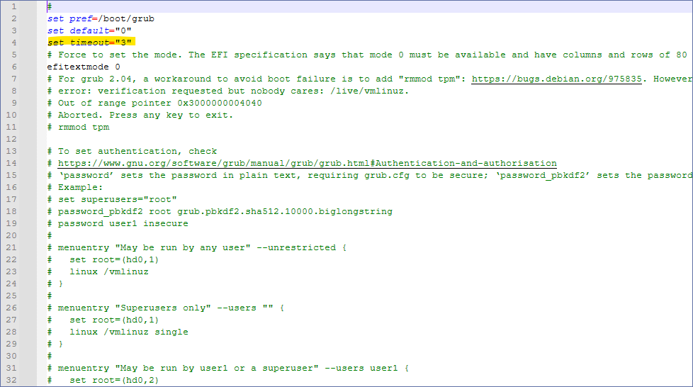 5.將Grub.cfg改為無人值守,首先第4行set timeout=”3″,進入還原後畫面停留3秒(預設30秒)