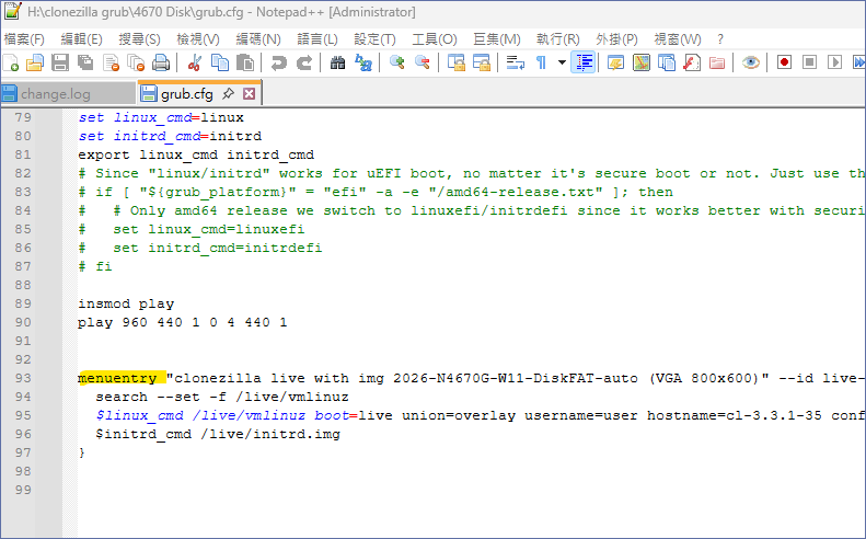 底下只保留進入clonezilla後第一組選單的menuentry ,第二組之後的全部刪掉避免老師誤觸
