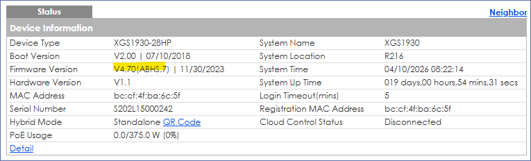 XGS1930-28HP配發下來好多年了,中間也陸續更新過幾次Firmware,目前使用中的版本仍是2023年官方釋出的V4.70(ABHS.7)。