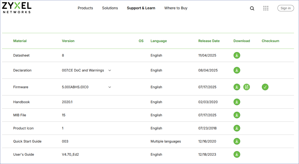 雖然ZYXEL進到學校的數量不多,時間上也沒有HP那麼久,但是在資源取得方面相當便利,目前XGS1930-28HP的韌體出到2025年7月的V5.0,可於此下載,https://www.zyxel.com/us/en-us/support/download?model=xgs1930-28hp