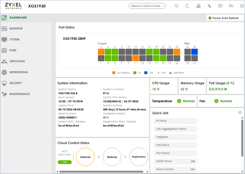 幸運的是官方到目前都還有持續支援XGS1930這個型號的更新,讓XGS1930-28HP不至於變成孤兒。早期甚至到疫情期間我一直最愛的其實都是HP Procurve系列,直到現在手邊也仍有HP在線上服役,也是穩得沒話說而且選用的系列都有終身保固,舉凡2910、2520、1800…但因年代久遠、外商企業併購、帳號或雲端授權…等問題,想繼續取得更新資源都不再友善。且隨著學校內網邁入了10G,這幾個型號遂逐漸失去了光環…