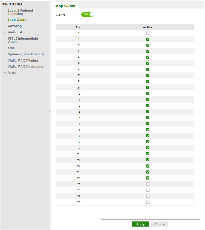 啟用Loop Guard之後,除了外線Uplink以外的通訊埠全部打勾,避免底下接上來的設備發生迴圈,而Uplink埠在此不勾,外線要另外透過RSTP進行防護。要留意Loop Guard這邊1-24埠勾了,下一項RSTP 的Active1-24就不要勾,否則設定會衝突。