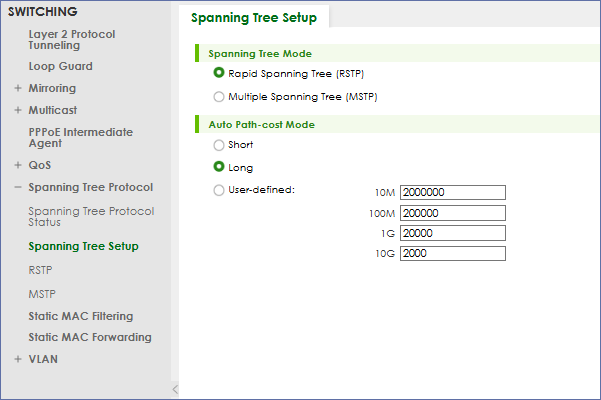 Spanning Tree Mode預設就是Rapid Spanning Tree (RSTP)無須更改