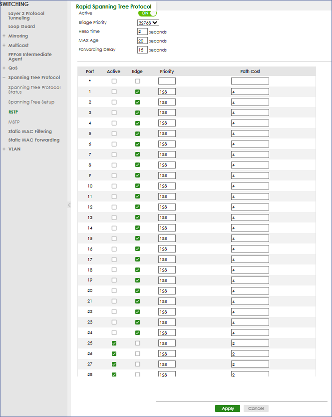 RSTP內的設定Active1-24埠不要勾,交給前面Loop Guard防護即可。Uplink25-28勾起來就能具備RSTP迴圈防護的效果,而1-24埠給電腦或終端設備用的在RSTP、Loop Guard只能二擇一,兩個都勾的話會造成衝突,基本上終端設備交給Loop Guard處理就好了;而Edge1-24埠勾起來連了就上不需等待STP偵測的時間延遲,但是在Uplink則不勾。