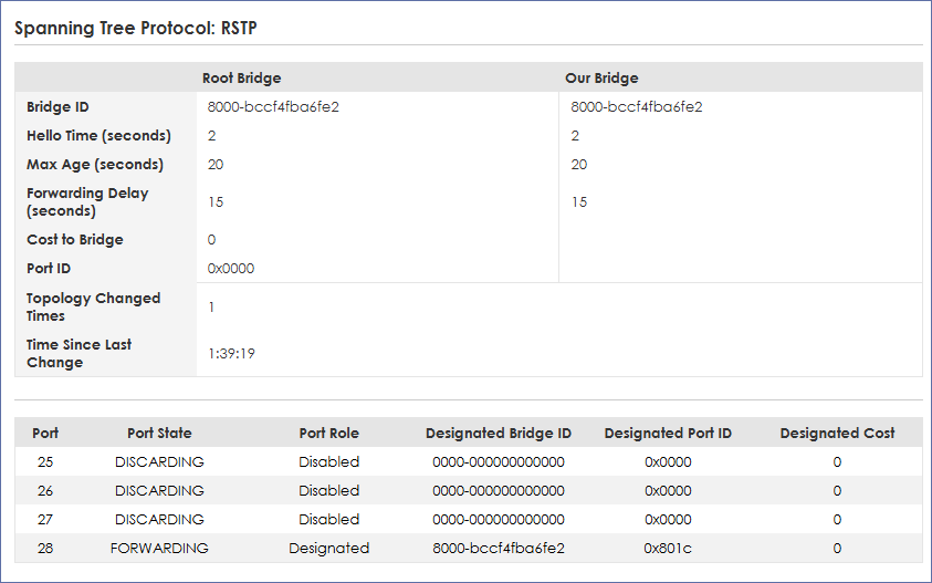 RSTP啟用之後的狀態,有抓到28埠是FORWARDING(轉送中),目前只先更新測試第一台,另外還有三個處室也都是同款需要更新及設定迴圈防護,在底下看到Root Bridge與Our Bridge的ID相同,表示這台目前是學校ZYXEL設備在網路環境生成樹(Spanning Tree)中的第一台,所以會自己先充當大哥。當其他處室的1930都更新之後,如果彼此之間有上下層串接,預設就會以ID最小的當Root,但我的架構沒有互串,全部都是單一Uplink向上接到光纖交換器,這種情況下四台都會顯示自己是 Root Bridge,Root與Our Bridge ID也都會相同,每一台都說自己是老大的意思…
